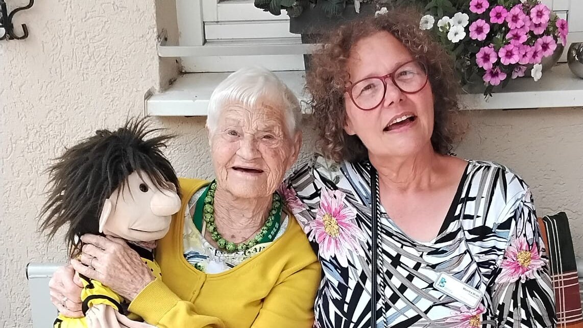 „Moritz nehme ich gerne mit und auf ihn sprechen mich die Bewohnerinnen und Bewohner schon am Eingang des Hauses an, wenn sie mich kommen sehen! …Er ist allerdings ein bisschen frech. Er duzt einfach alle, bohrt in der Nase, bis er von jemandem ein Taschentuch bekommt oder ist mit offenen Schuhen unterwegs, bis jemand ihm die zubindet.“ Monika Muth, Ehrenamtliche im Wichernhaus in Iserlohn strahlt, wenn sie erzählt: „Für mich ist ja das Siezen selbstverständlich, gutes Benehmen. Moritz ist ganz anders als ich!“ Es funktioniert genauso, wie es sich die inzwischen 62-Jährige vorgenommen hat: Ihre bunt angezogene Handpuppe Moritz aktiviert die Lachmuskeln und die Hilfsbereitschaft der betagten Menschen im Wichernhaus. Sie helfen dem frechen Kerl nämlich sehr gerne, aktivieren ihre Finger, um Halstuch oder Schuhe wieder fest zu machen!